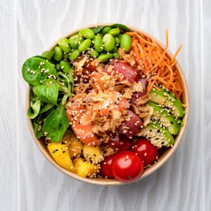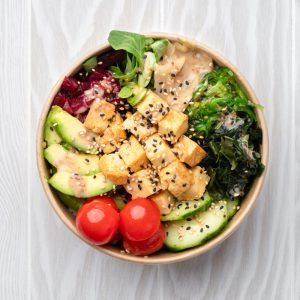 Tofu frit, riz blanc vinaigré, sauce soja, salade mêlée, gingembre mariné, salade d’algues, wakame, concombre, tomates cerises, avocat, betterave, vinaigrette sésame.