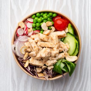 Boulettes de poulet, riz blanc vinaigré, jus de yuzu, vinaigrette sésame, salade mêlée, chou rouge, concombre, échalote, tomates cerises, radis rouge, petits pois, vinaigrette wasabi, noix de cajou.