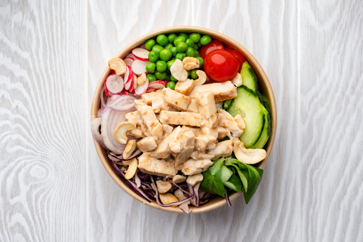 Boulettes de poulet, riz blanc vinaigré, jus de yuzu, vinaigrette sésame, salade mêlée, chou rouge, concombre, échalote, tomates cerises, radis rouge, petits pois, vinaigrette wasabi, noix de cajou.